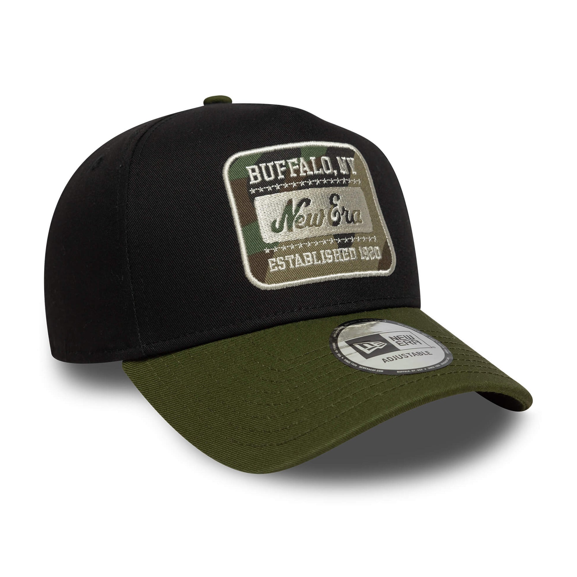 · Šiltovka New Era 9FORTY E-Frame Camo Patch v čiernej farbe s nášivkou New Era Heritage Script na prednej strane.