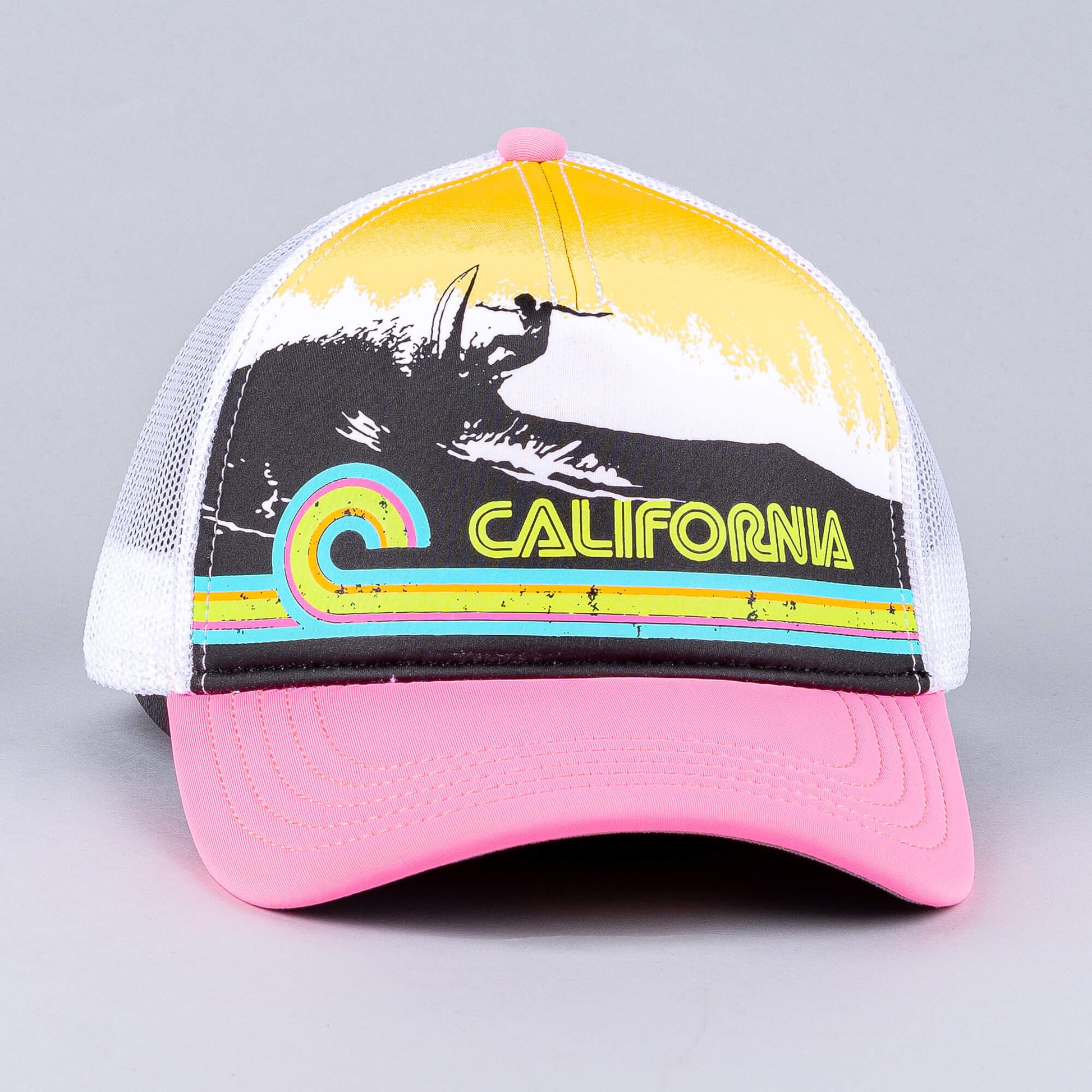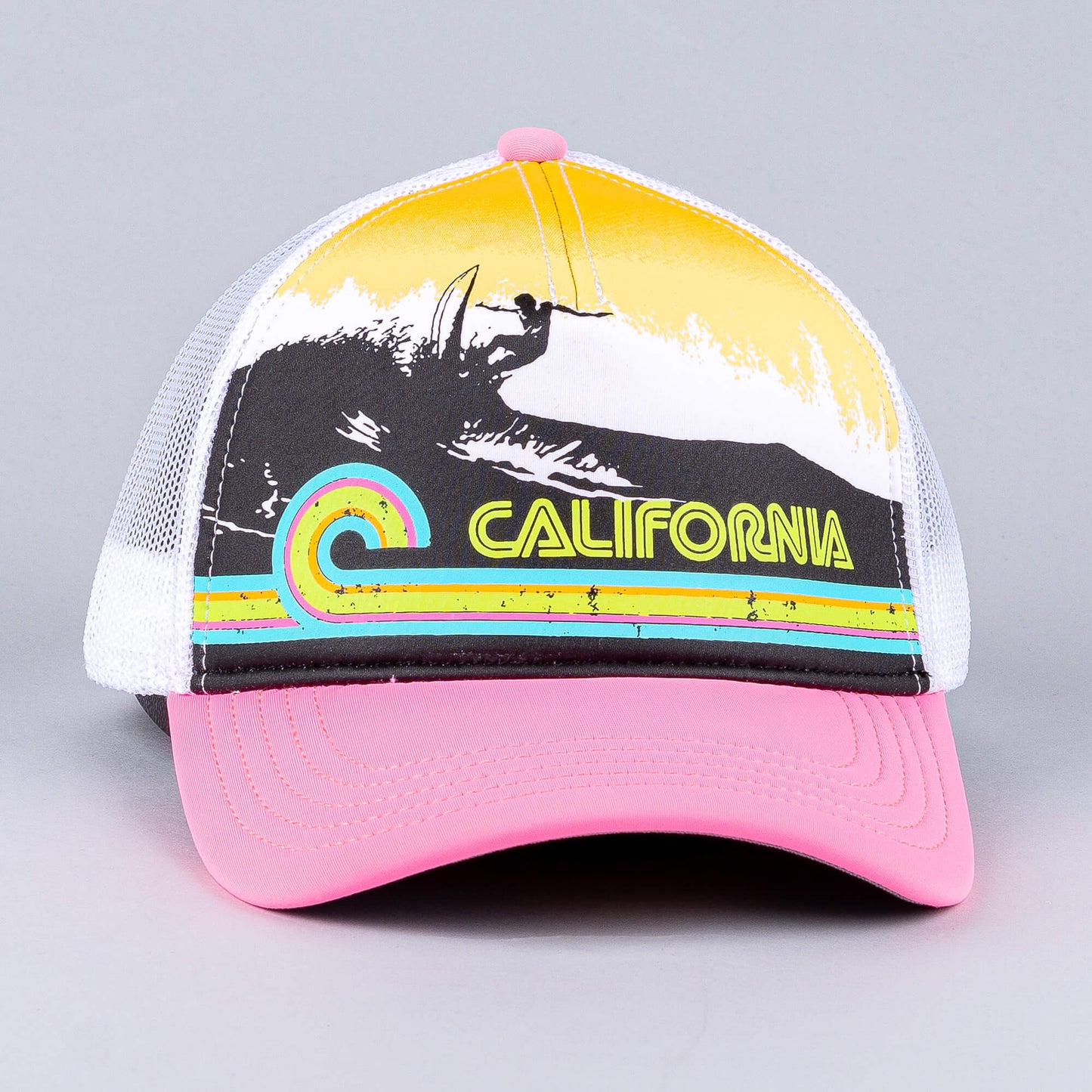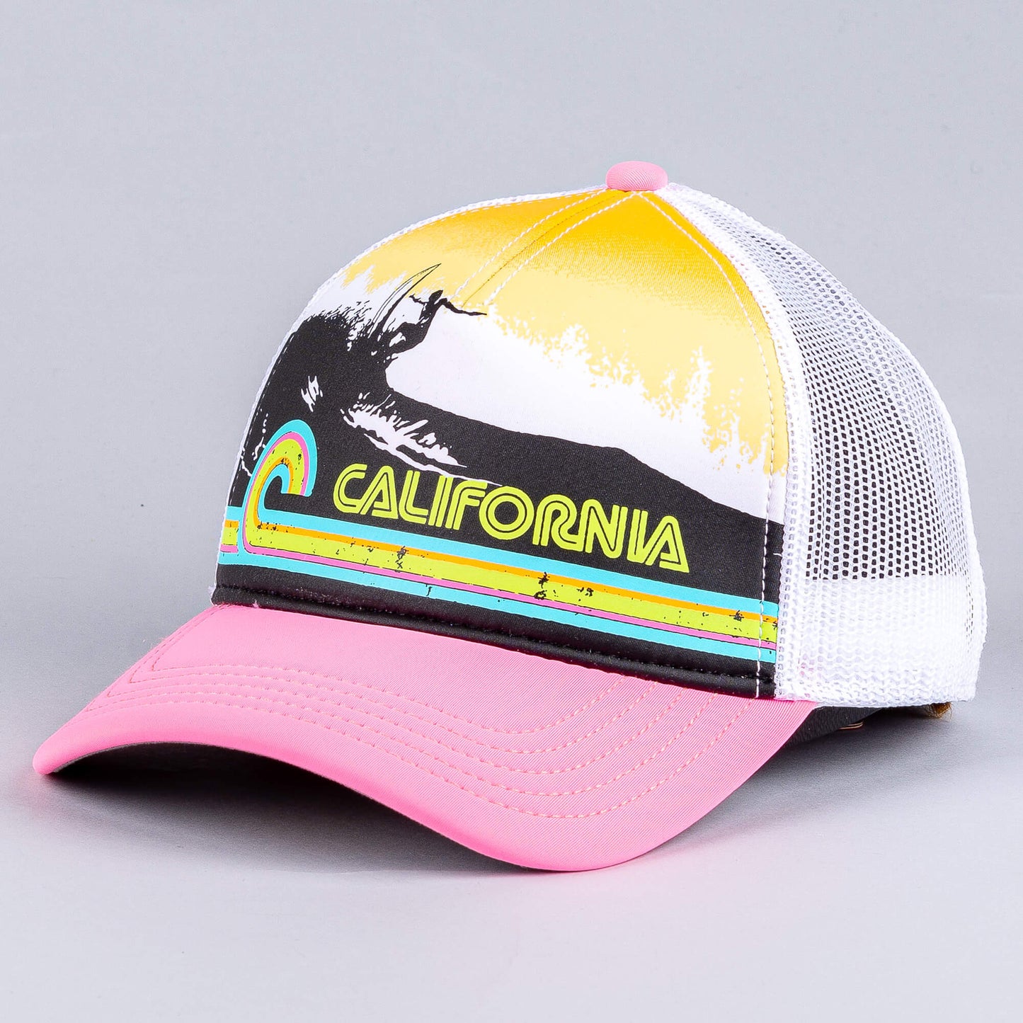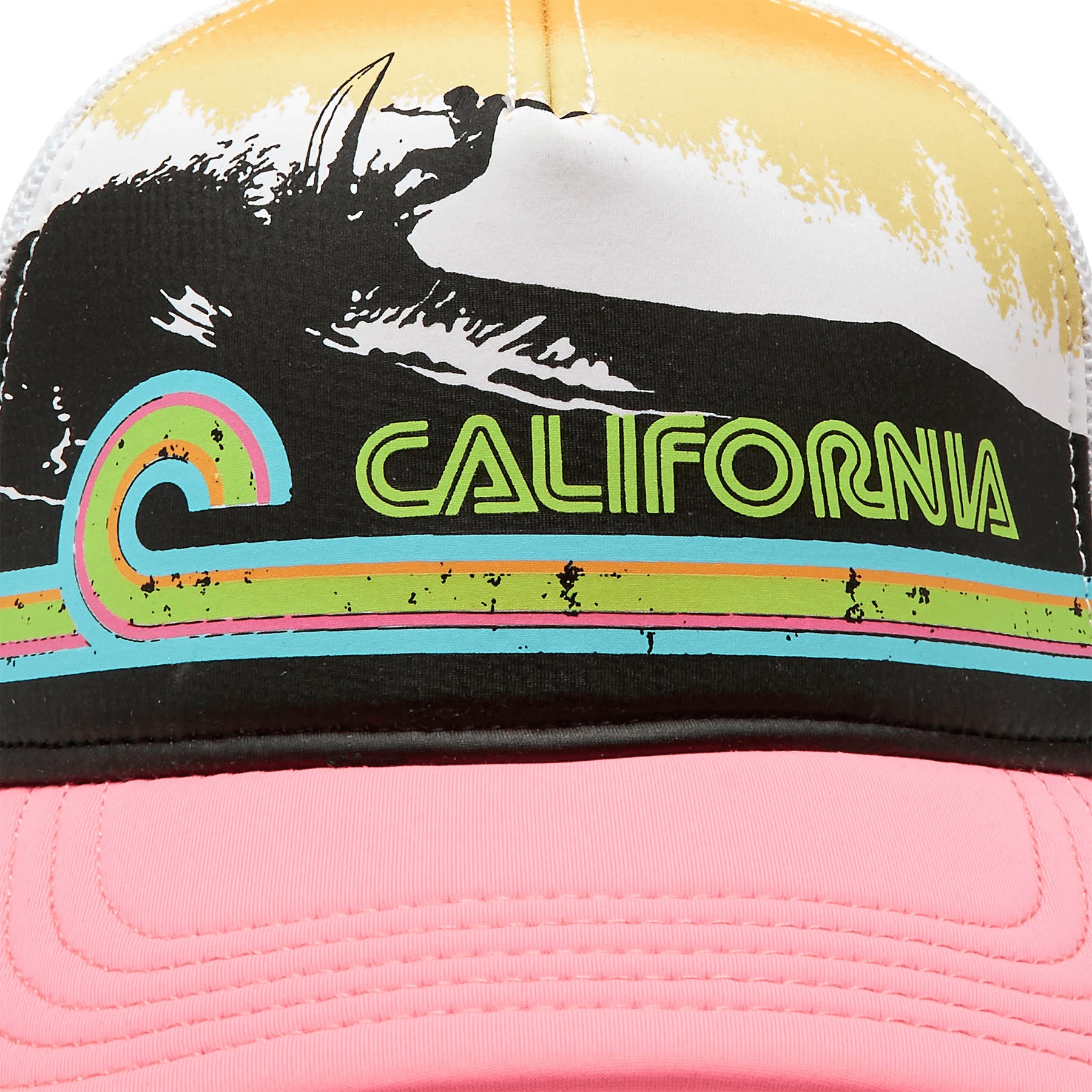 Biela šiltovka so sieťkou American Needle Riptide Valin - California. Päťpanelová štruktúrovaná korunka z brúseného plátna so sieťovanými bočnými a zadnými panelmi. Predkrivený okraj a snapback. Vyšívaná nášivka s meravým vzorom na prednej strane.