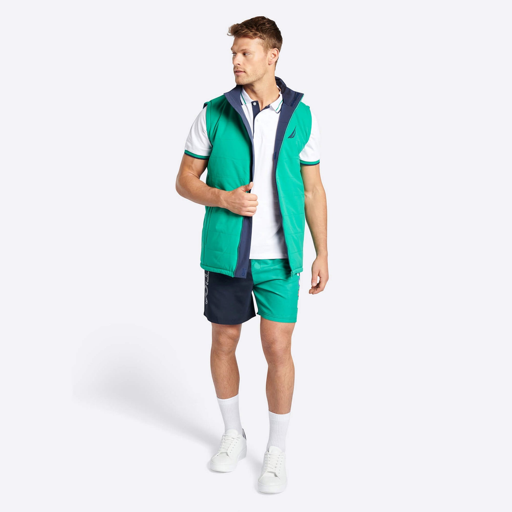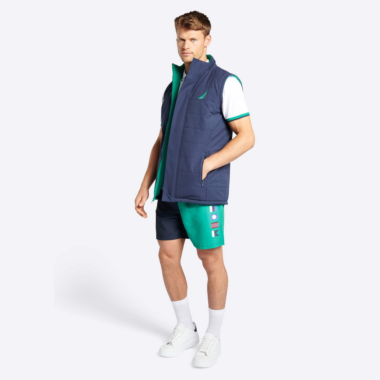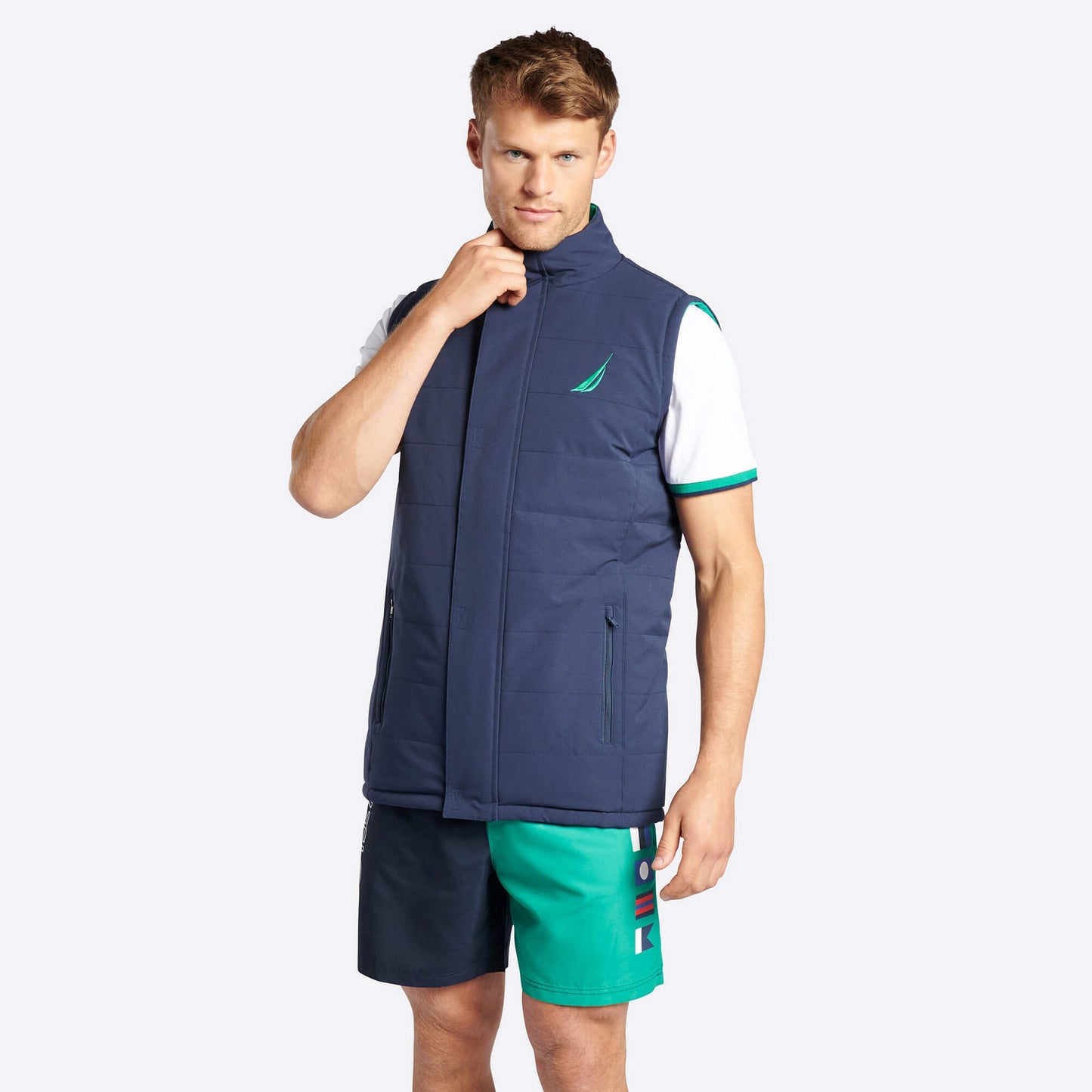 Pánska vesta Nautica Tamar Reversible Gilet, navrhnutá na prechodné mesiace, ktorú môžeš používať obojstranne. Jej syntetická podšívka vás udrží v teple aj za nepriaznivých poveternostných podmienok bez obmedzenia ventilácie, Prispieva k zachovaniu tepla produkovaného telom a zabraňuje tepelným stratám, vďaka čomu sa nositeľ môže cítiť chladnejšie a pohodlnejšie. Pomocou hlavného otvoru na zips s krytom ľahko regulujete svoj tepelný výkon a do jeho vonkajších vreciek na zips pohodlne uložíte svoje najdôležitejšie cennosti. Strih Regular Fit zaisťuje úplnú voľnosť pohybu a umožňuje aj vrstvené technické oblečenie. Stojačik chráni pred studeným vetrom. Vďaka športovému strihu je dobrá a všestranná za každých podmienok, či už ide o víkendový výlet alebo plavbu, ale s maximálnou spokojnosťou ju môžete nosiť aj na bežné všedné dni.