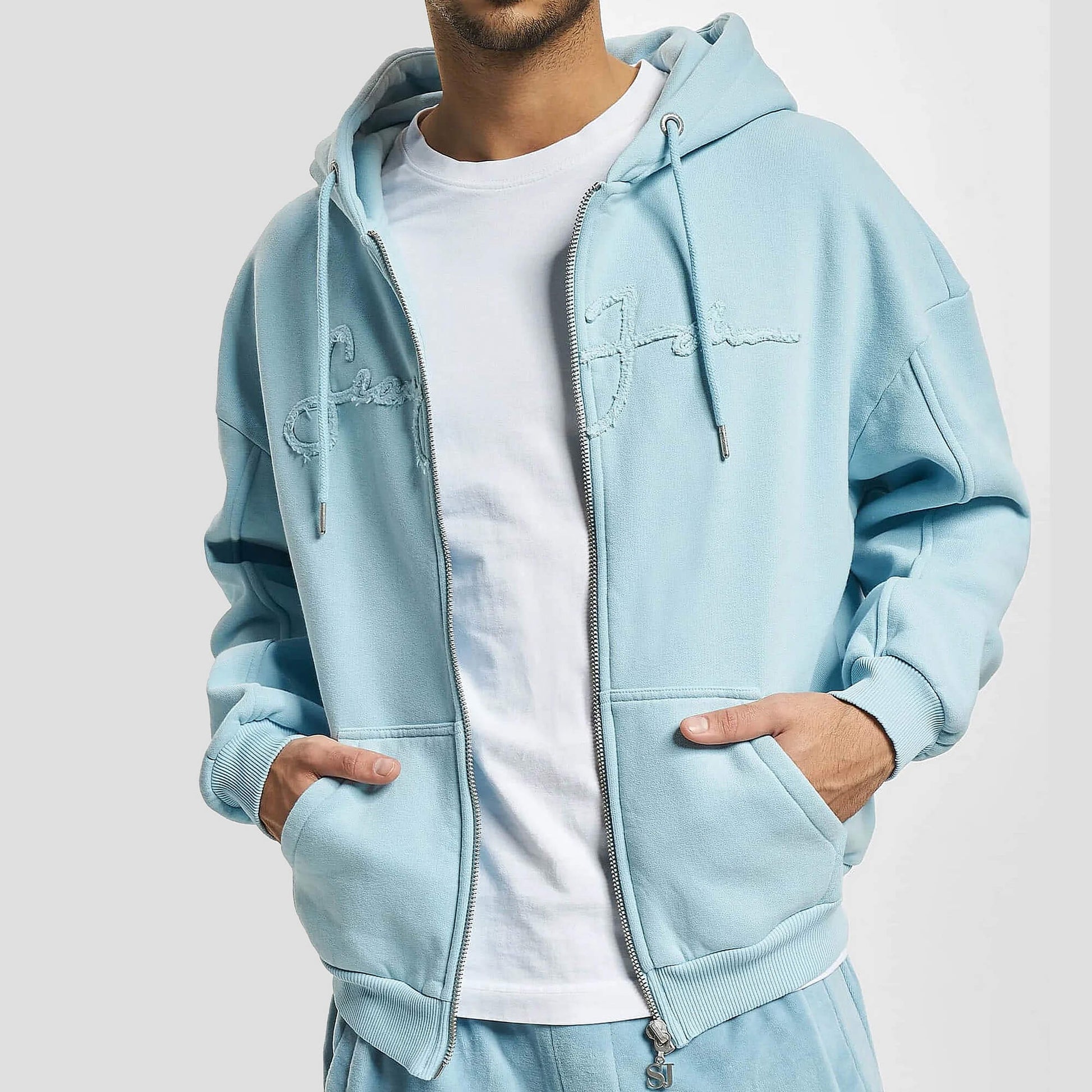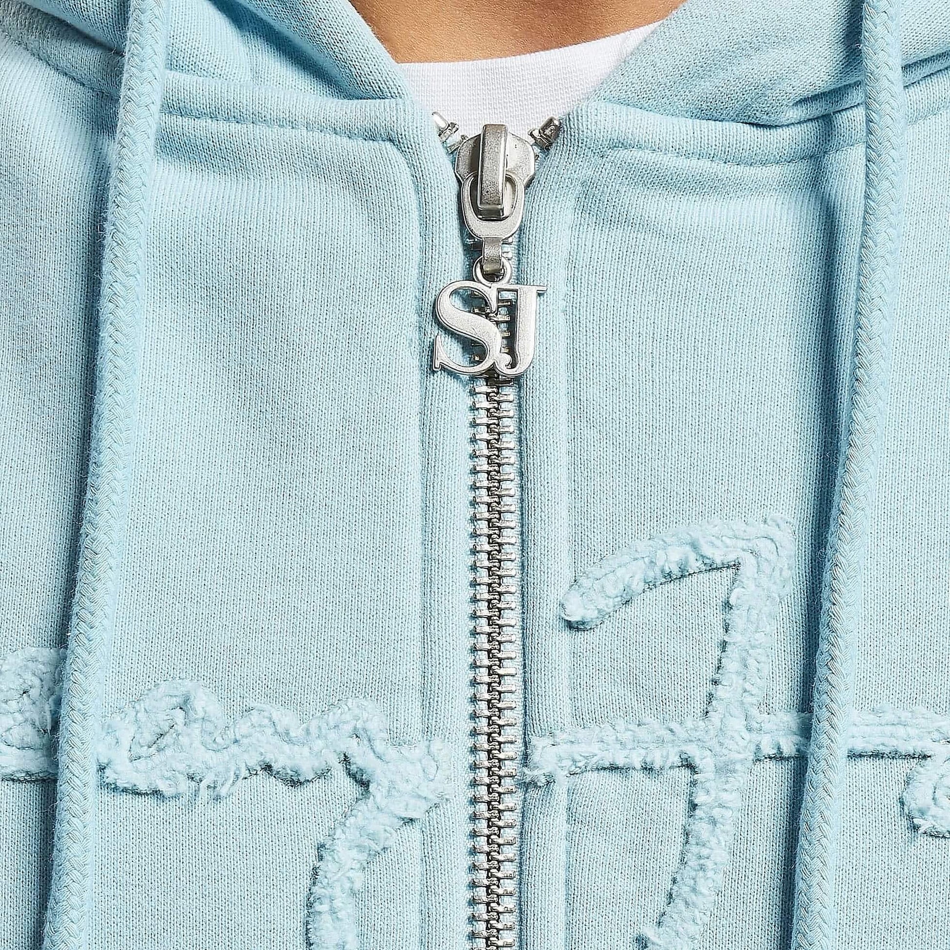 Sean John SJ Script Logo Distressed Zip Hoodie - light blue